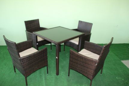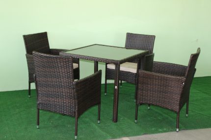 материал: синтетичен ратан 7-8mm x 1,2mm;конструкция: стоманена рамка;Комплектът включва:Четири фотьойла, размери: 60x61x85(h) cmЕдна маса, със закалено стъкло с дебелина 5mm;Имат подвижни