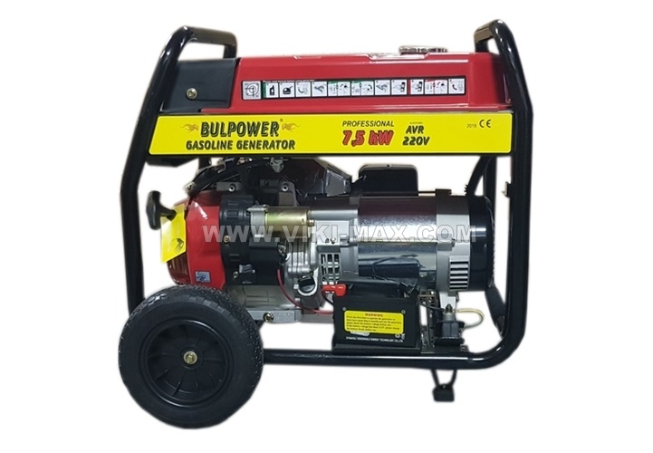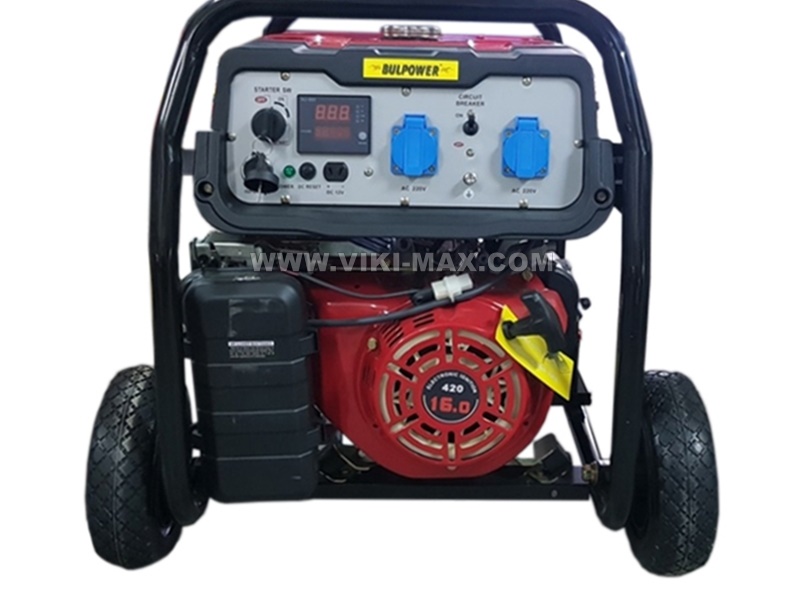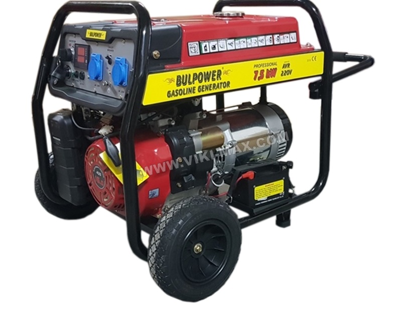 Нови бензинови четиритактови генератори Bulpower, с вградена автоматика за монофазен ток – 7,5 KW. Генераторите са с медни ротори и статори. Бензинов двигател VТX 760 с въздушно охлаждане, 16 конски сили, работна честота: 50 Hz. Вграден AVR /Automatic Voltage Regullator/. Автоматичен предпазител против претоварване на генератора. Магнетен стартер и автостартер с ключ и акумулатор. Транспортна рамка с колела и дръжки за по-лесно предвижване на генератора. Генератора има вграден дигитален дисплей показващ изходящият моментен волтаж, херцовете и отработените моточасове. 2 броя изходи за 230 V и един изход за 12 V. Нивото на шума е 69-72 dB. Възможност за автоматично стартиране /спиране на генератора при отпадане/възстановяване на основното ел. захранване. Разход: 450 грама бензин на киловат час при пълно натоварване. Размери: дължина 68 см., ширина 51 см. и височина 55 см. Тегло 105 кг.
