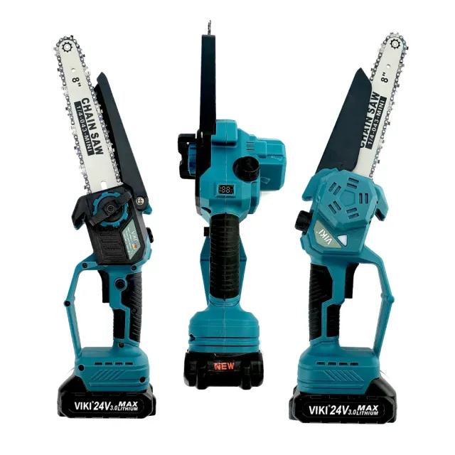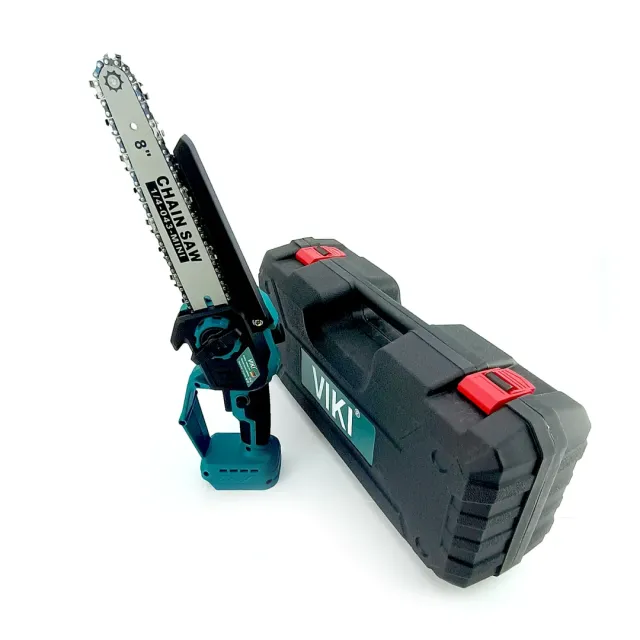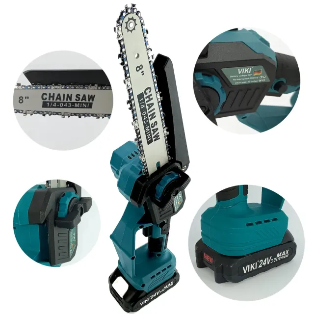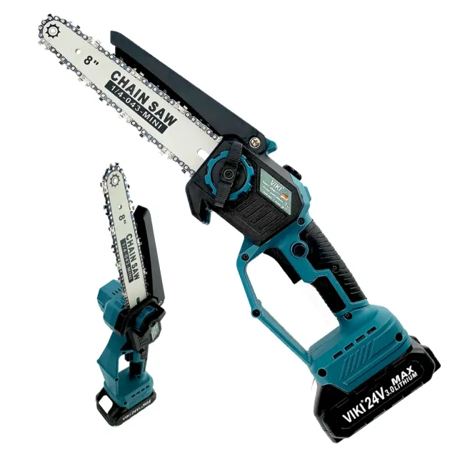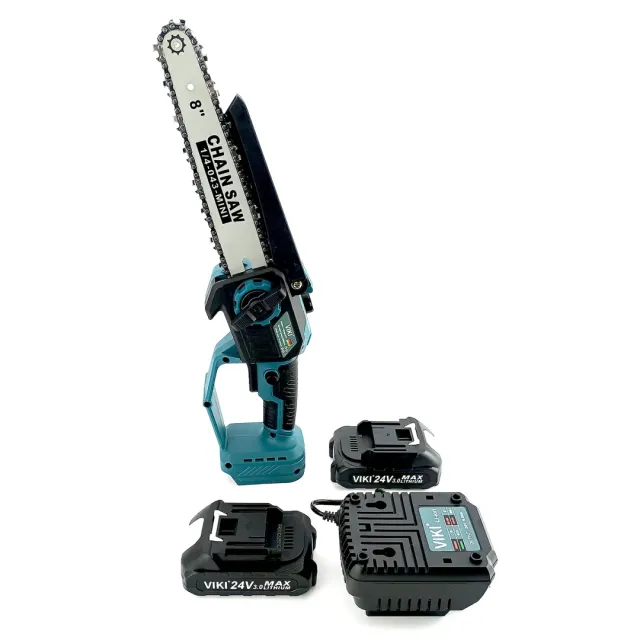 Акумулаторен верижен трион за дърва с автоматично смазване на веригата. Отличен за работа в градината. Малкият размер позволява подрязване на труднодостъпни места. Силна мощност, дълъг живот и трайна продукция. Нехлъзгаща се дръжка, удобна амортизация, ергономичен дизайн. Защитна дъска за предотвратяване на пръскане на дървесни стърготини. Висококачествена водеща, дълбоко закалена верига има по -висока устойчивост на износване и гладък ефект на рязане. Защитни от прах отвори за разсейване на топлина, ефективно разсейване на топлината, без изгаряне. Спецификация: Скорост на празен ход: 2000 (об/мин). Нетно тегло: 0,9 (кг). Пълна дължина: 42 (cm). Дължина на шината: 8″. Включва: 1бр. верижен трион, 1бр. ръководство, 1бр. верига 1бр. инструкция, 2бр. батерий 24V3Ah, 1бр.зарядно устройство, 1бр. куфар, 1бр. масльонка.