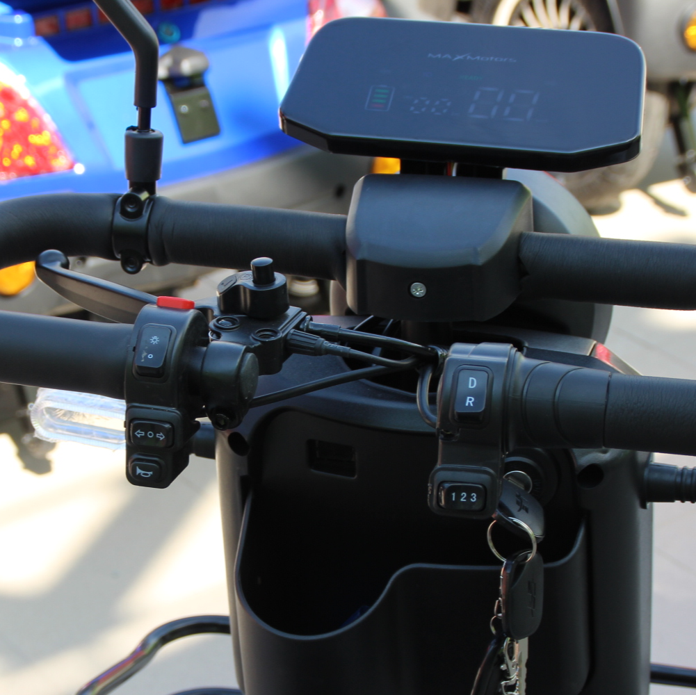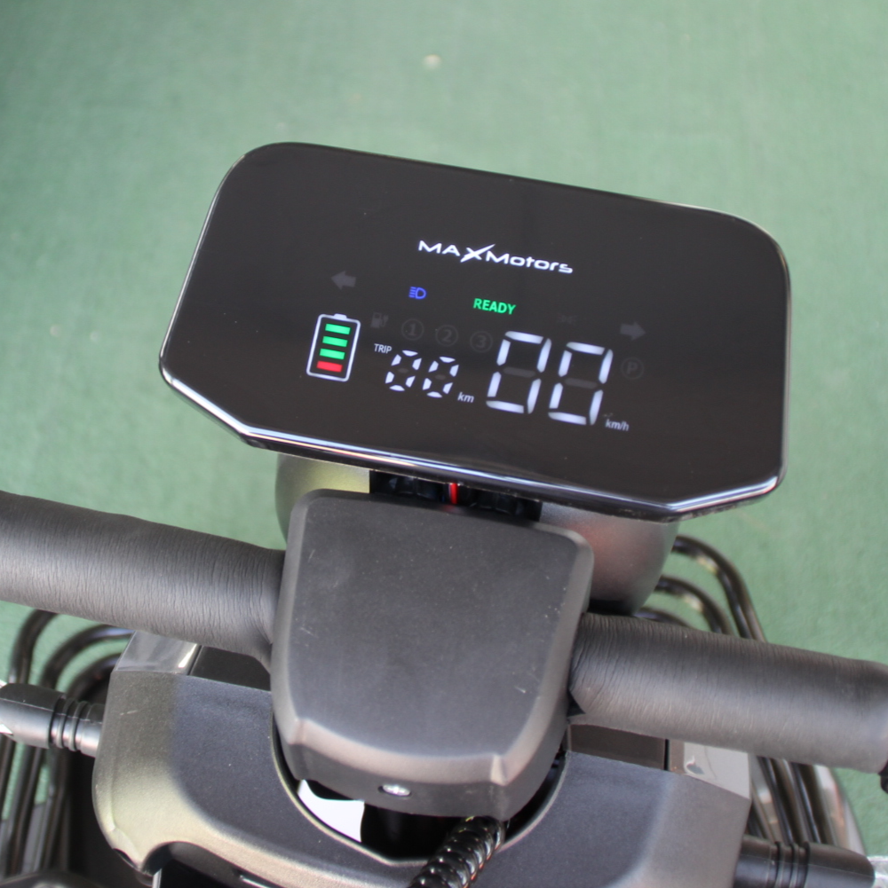 Новият модел електрическа четириколка MaxMotors A9 GRAY е оборудвана с пълна LED светлинна окомплектовка, голям цветен дисплей. С мощният си двигател 1500W и големите батерии 48V/20Ah може да преодолява наклони до 25°. Перфектият избор на превозно средство да отидете на разходка в парка или до магазина на пазар, има две големи кошници за багаж!