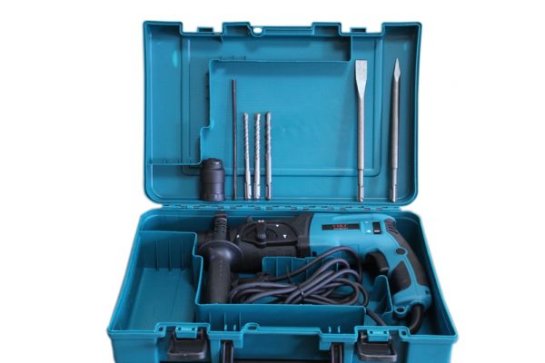 Тип продукт: Перфоратор. Тип занимание: Професионално. Тип захранване: Мрежово. Повърхност за работа: Дърво, Метал, Бетон. Тип патронник SDS + Съдържание: пакет 1 х Транспортна чанта Цвят – Черен Син. ТЕХНИЧЕСКИ ХАРАКТЕРИСТИКИ – Мощност 900 W. Максимална скорост (об/мин) 1100. Брой перкуции в минута 4500. Енергия на перкуция 2.4 J.. Тегло 2.6 Kg. Диаметър пробиване в бетон 24 мм. Диаметър пробиване в стомана 13 мм. Диаметър пробиване в дърво 32 мм.