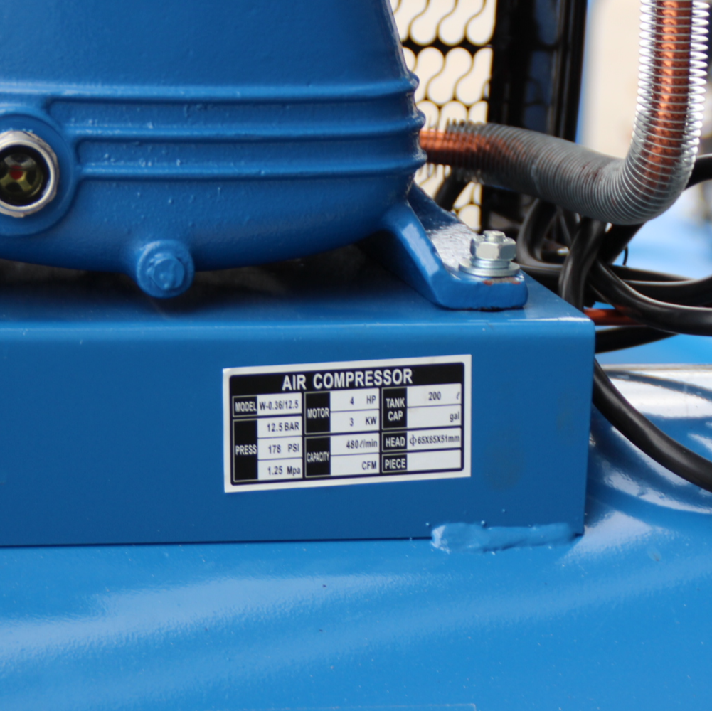 Компресорът разполага с мотор с мощност 4 HP (3 kW), който осигурява дебит от 480 литра в минута и максимално налягане до 12.5 bar (1.25 MPa / 178 PSI). Това го прави подходящ за широк спектър приложения — от боядисване и пневматични инструменти до индустриални и сервизни дейности.