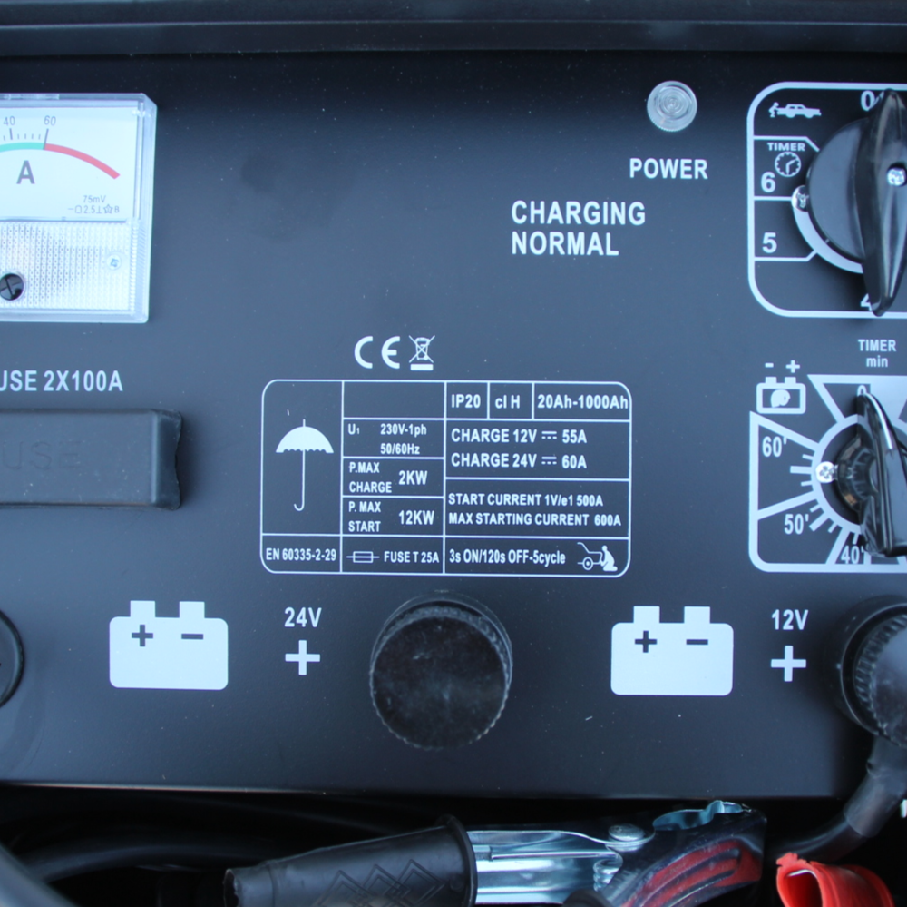 Професионално зарядно и стартерно устройство модел CD – 1200 А за зареждане на всякакви батерий и акумулатори с напрежение 12/24V и стартиране на всички бензинови и дизелови превозни средства. Стартов ток 1200 ампера. Избор между нормално и бързо зареждане,бърз старт. Показване на зареждане и пусковия ток. Защита от претоварване и обратна полярност. В комплекта са включени захранващи кабели и накрайници.