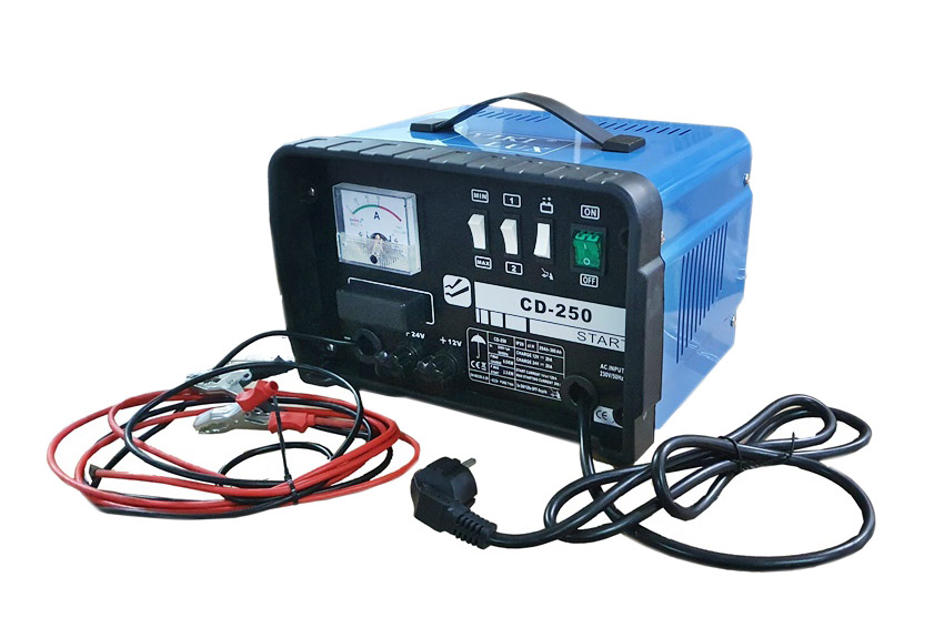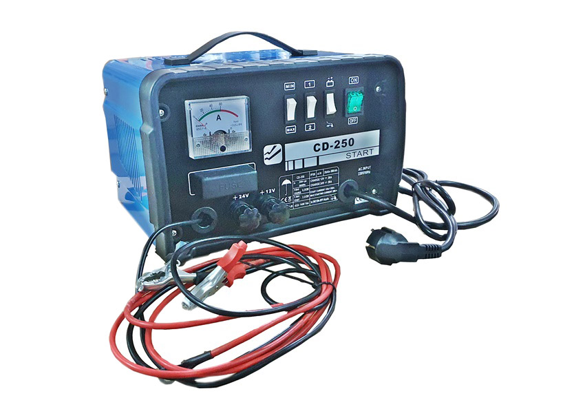 Професионално зарядно истартерно устройство модел CD – 250 А за зареждане на всякакви батерий и акумулатори с напрежение 24/48V и стартиране на всички бензинови и дизелови превозни средства. Стартов ток 250 ампера. Избор между нормално и бързо зареждане,бърз старт.Показване на зареждане и пусковия ток.защита от претоварване и обратна полярност. В комплекта са включени захранващи кабели и накрайници.