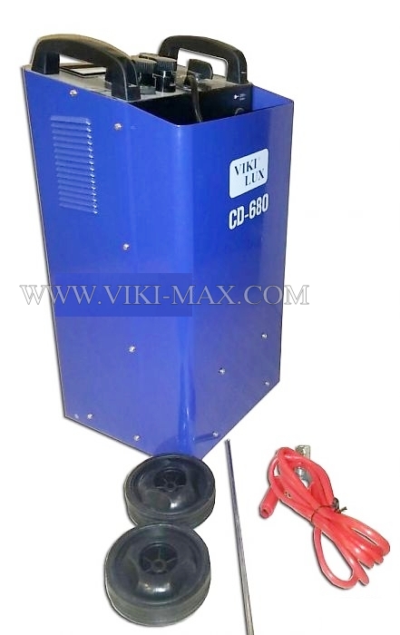 Професионално монофазно стартерно и зарядно устройство VIKI CD 680 на колела за зареждане на акумулаторни батерии с напрежение 12 / 24 V. Стартиране на всички видове автомобили, джипове, лекотоварни камиони, земекопна техника, трактори и камиони. Охлаждане с вентилатор. Оборудван с избор за нормално зареждане, бързо зареждане (BOOST), бърз старт и амперметър. Тегло бруто: 25 кг. Гаранционен и следгаранционен сервиз.