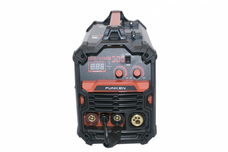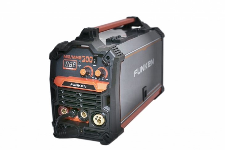 FUNKEN MIG 300 А ММА професионални инверторни заваръчни апарати с вградено телоподаващо устройство с уникални размери. С тях се заваряват всички черни метали, алуминий, неръждавейка, чугун, бронз и месинг. Захранваща мощност: 6,2 kVA, монофазни /220V/, ампера, степен на защита: IP 21.Работи с телове размери 0.6 , 0.8 и 1.0 мм. и с ролки от 1 и 5 кг. Тегло – 15 кг. без ролка.