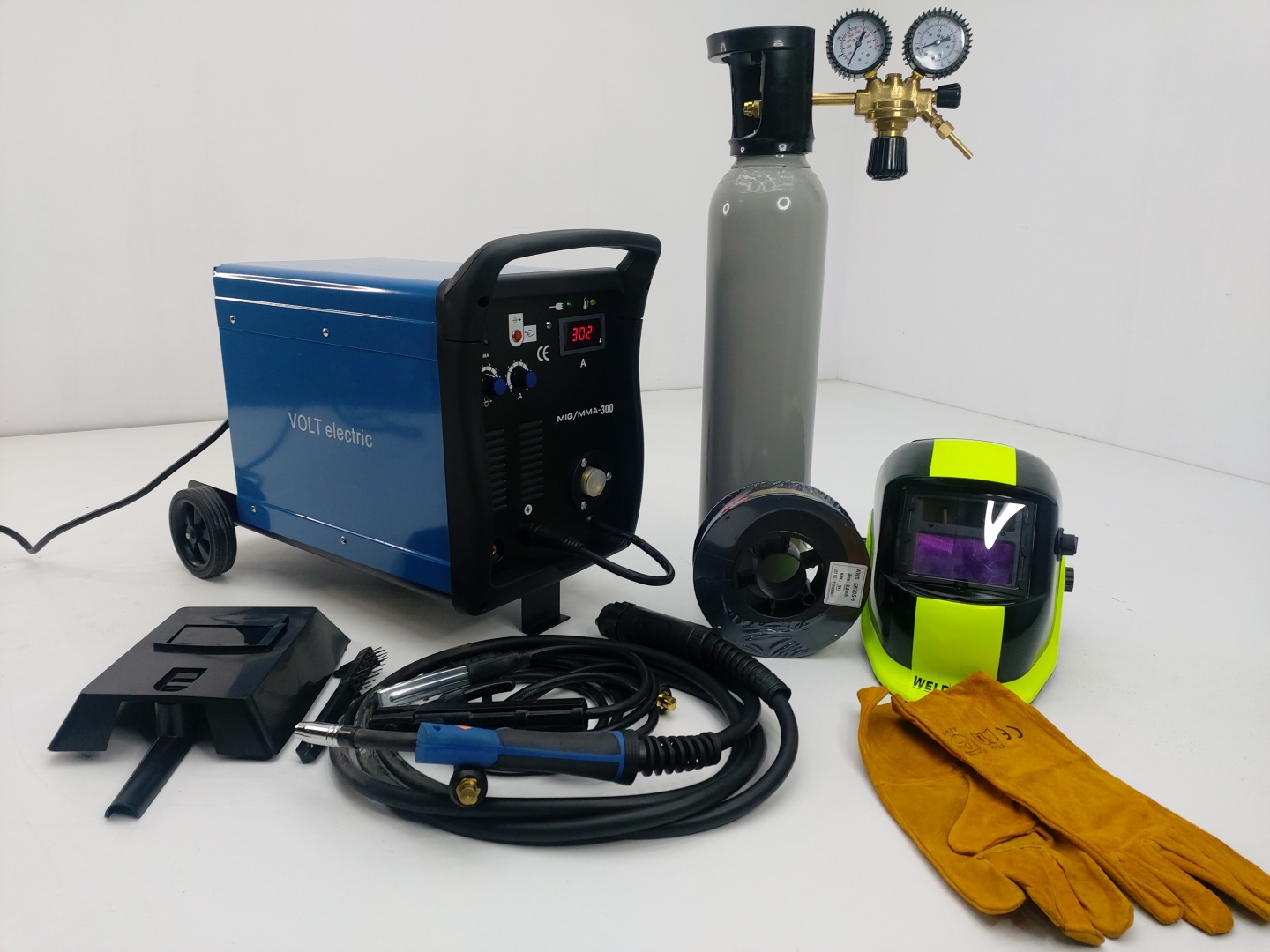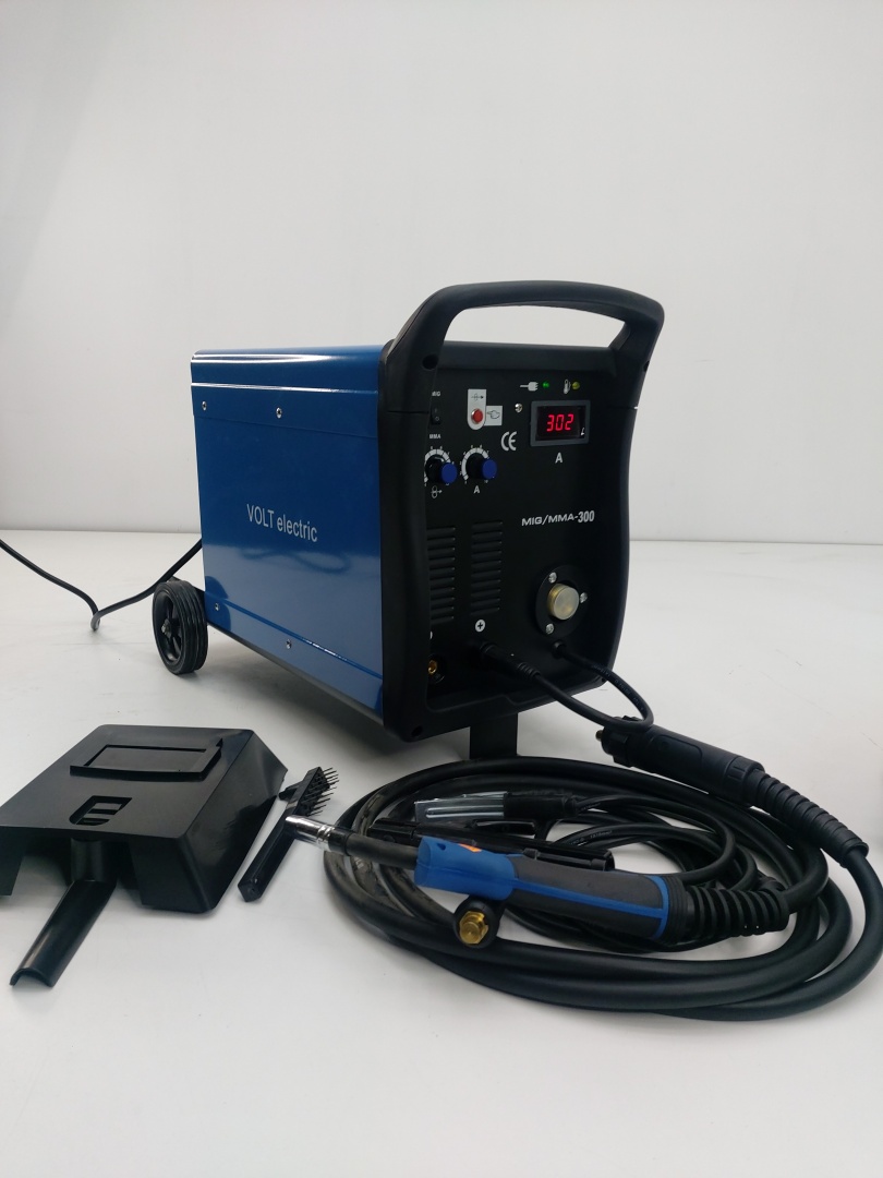 професионално инверторно телоподаващо устройство MIG/MMA 300А VOLT electric с електрожен, за монофазен ток. Висок клас технология. Регулиране на заваръчния ток/плавно/ 20-300A ампера, монофазен /230V/. Степен на защита – IP 23S. Работи с ролки от 1до 5 кг. Окомплектовани са с еврошланг за МИГ/МАГ заваряване, щипка маса, маска, чукче с четка,оригинални ръкавици за заваряване от телешка кожа, ролка 5 кг. Предназначен е за ремонтни и сервизни дейности. Поради широкия спектър на заваряване с HITECH ТЕХНОЛОГИЯ, заварява почти всички видове метал и е удобен за монтажни заварки от професионалисти и начинаещи заварчици. Телоподаващо MIG/MMA 300А VOLT electric, може да се окомплектова с манометър и малка бутилка СО2 или 6.7 литра цена на пълек комплект 920лв.