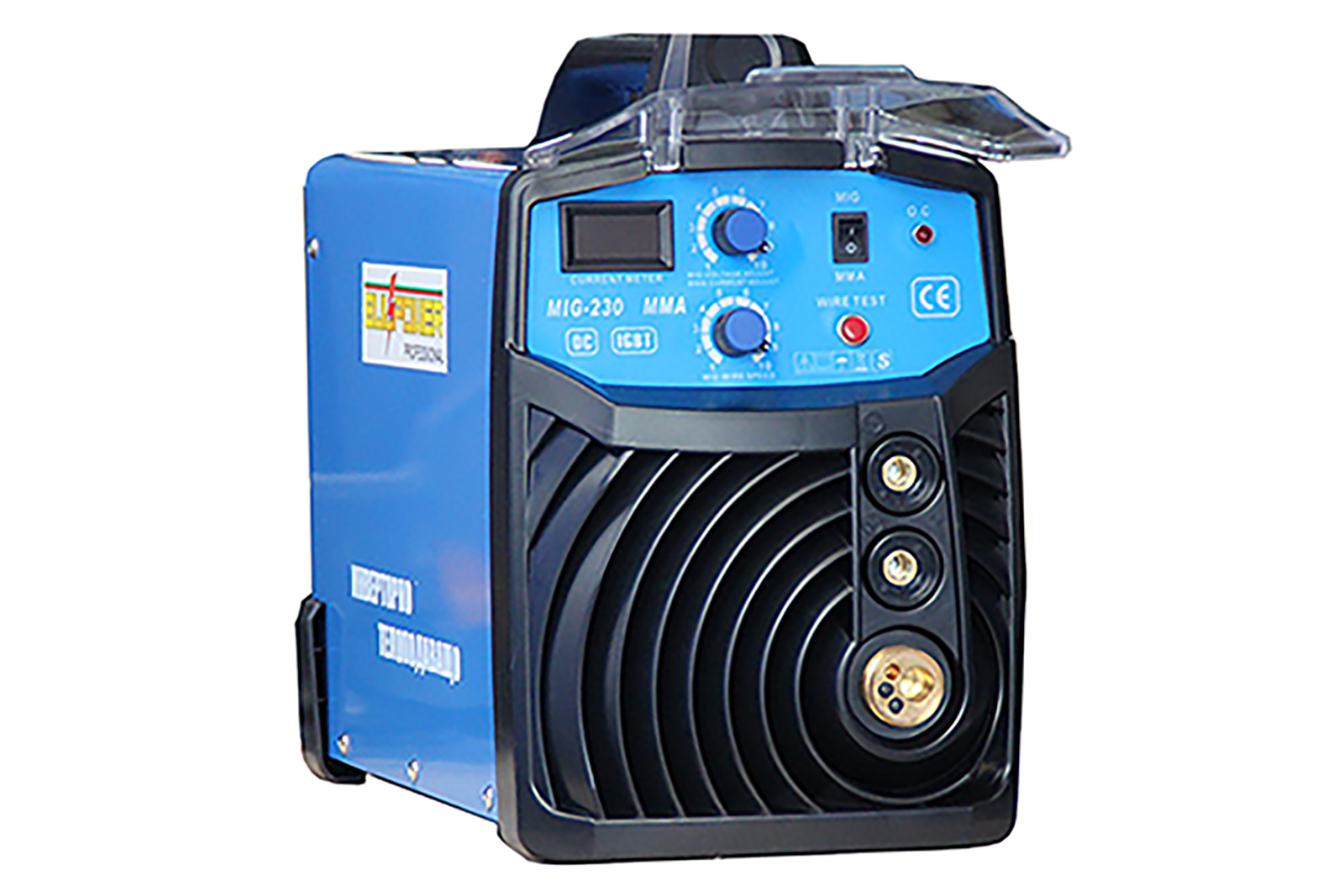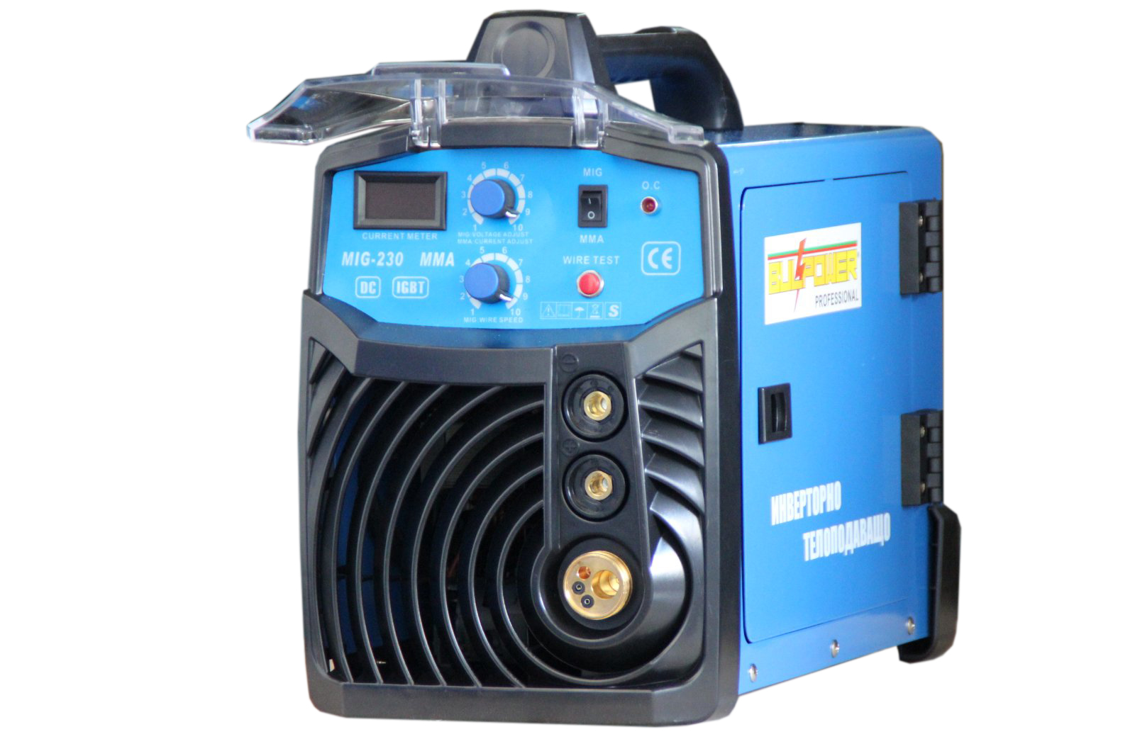 Предлагаме на Вашето внимание, Bulpower MIG/ММА/ CO2 – 230P професионални инверторни заваръчни апарати с вградено телоподаващо устройство + електрожен с уникални размери. С тях се заваряват всички черни метали, алуминий, неръждавейка, чугун, бронз и месинг.Окомплектовани са с еврошланг за МИГ/МАГ заваряване, щипка маса, маска и чукче с четка,ролка 5 кг. Регулиране на заваръчния ток реално /плавно/ 30-230 ампера, монофазни /220V/. Захранваща мощност: 5,2 kVA, Степен на защита: IP 21. Работи с телове размери 0.6 , 0.8 и 1.0 мм. и с ролки от 1 и 5 кг. Размери Д/Ш/В : 37/26/32 см. Предназначен е за ремонтни и сервизни дейности. Поради уникално малкия си габарит, тегло и широкия спектър на заваряване с HITECH технология, заварява почти всички видове метал и е удобен за монтажни заварки от професионални и начинаещи заварчици. Телоподаващото може да се окомплектова с манометър и малка бутилка СО2 3 или 6.7 литра.